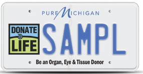 The standard license plate features a simple white background with blue text and the state's "Pure Michigan" tagline across the top. Its serial format is ABC 1234.