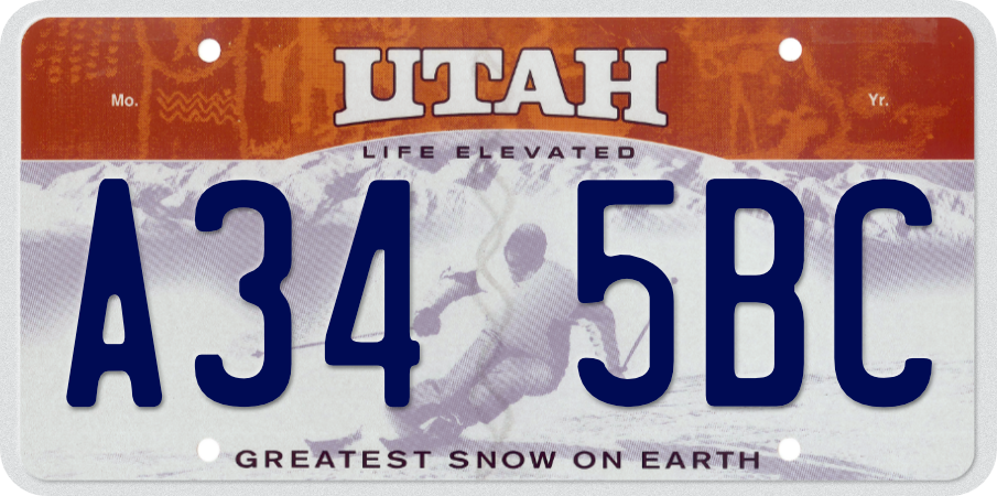 - Life Elevated Skier Plate: Honoring Utah's winter sports legacy, this plate displays a deep blue six-character serial with one letter, three numbers, and two letters. A faded skier image divides the characters. “UTAH” is in white at the top, followed by “LIFE ELEVATED” and “GREATEST SNOW ON EARTH” at the bottom.