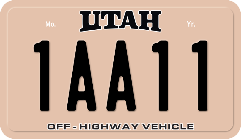 - Off-Highway Vehicle Plate: This plate has a beige background with a five-character black serial. “UTAH” is at the top center, with “OFF-HIGHWAY VEHICLE” printed below in black with a white shadow.